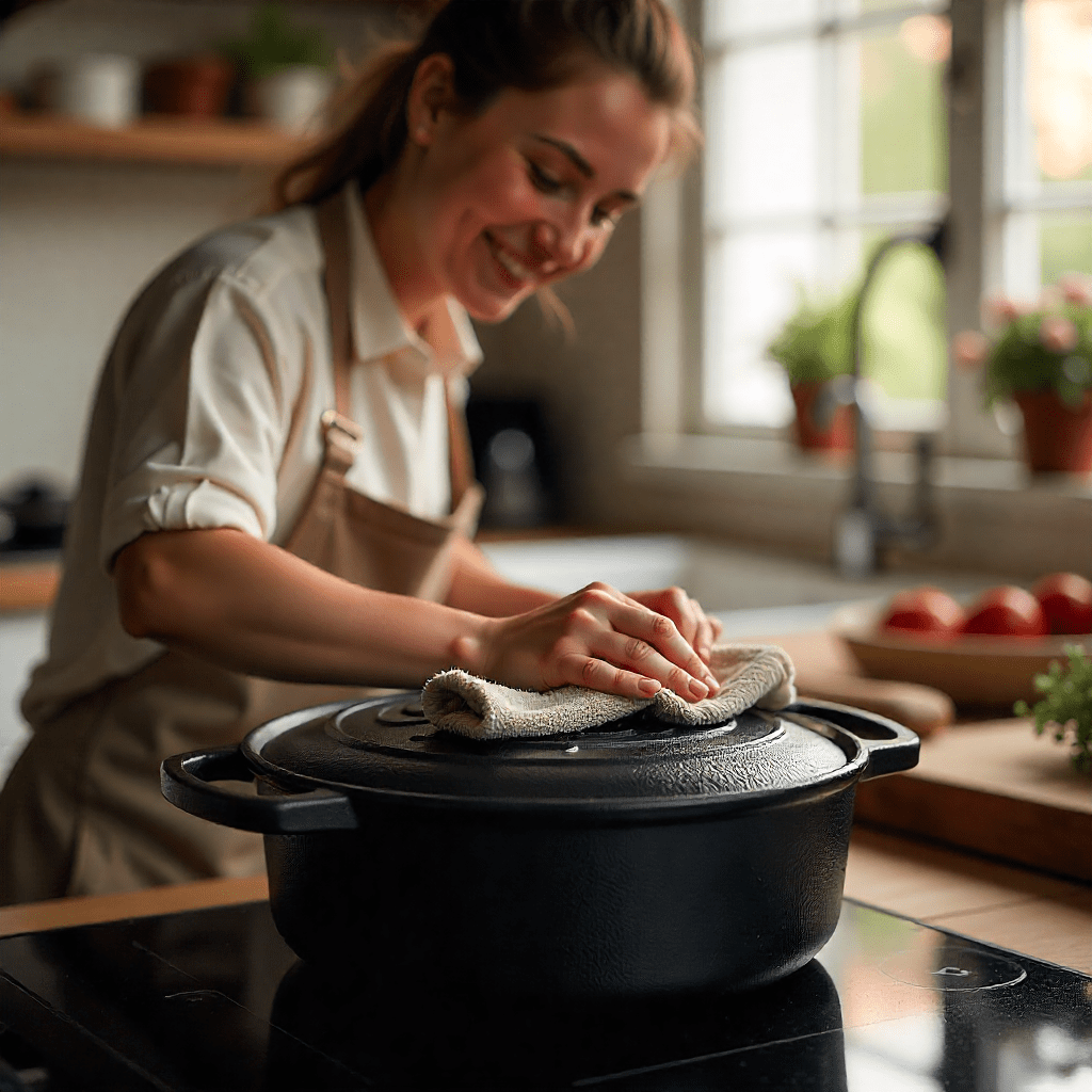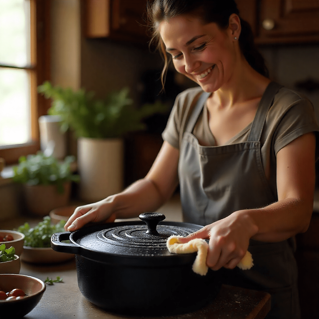 Pour la fonte émaillée : lavez à l’eau savonneuse, rincez et séchez. Pour la fonte brute : nettoyez à l’eau chaude sans savon, séchez immédiatement et huilez légèrement après chaque utilisation. Rangez toujours au sec avec le couvercle entrouvert.